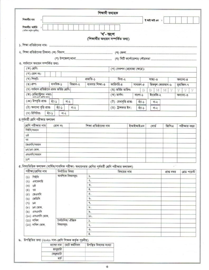 ৩. শিক্ষা ও অন্যান্য তথ্যাদি : যথাযথ সতর্কতা অনুসরণ করে শিক্ষার্থীরা তাদের পূর্বর্বতী ও বর্তমান শিক্ষাগত তথ্য প্রদান করবেন। শ্রেণি শিক্ষক ও প্রতিষ্ঠান প্রধান তা দেখে সত্যায়ন করবেন।